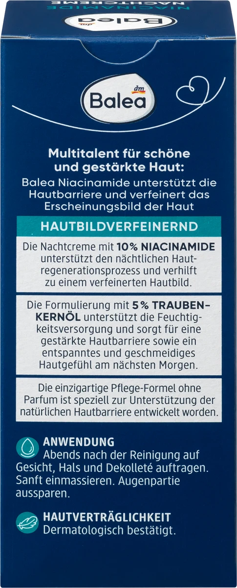 π€ Description: Unlock the secret to radiant, flawless skin with Balea's Niacinamide Night Cream. π With a potent blend of 10% niacinamide and 5% grape seed oil, our cream works tirelessly overnight to revitalize your skin.